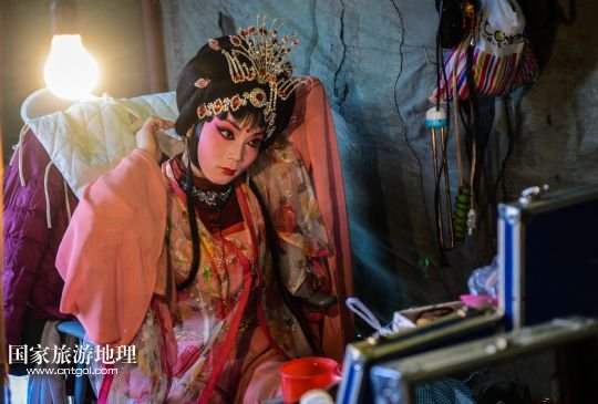 1月3日,武義壺山婺劇團(tuán)的演員在上臺前整理頭飾。