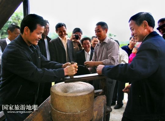 4月28日,游客在江西省靖安縣雙溪鎮(zhèn)大橋村體驗農(nóng)家推石磨。