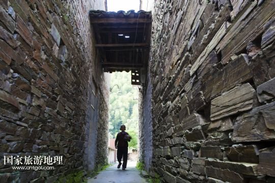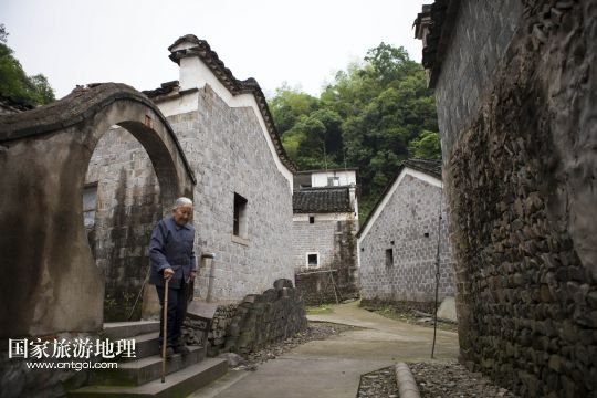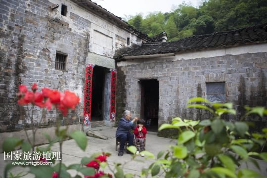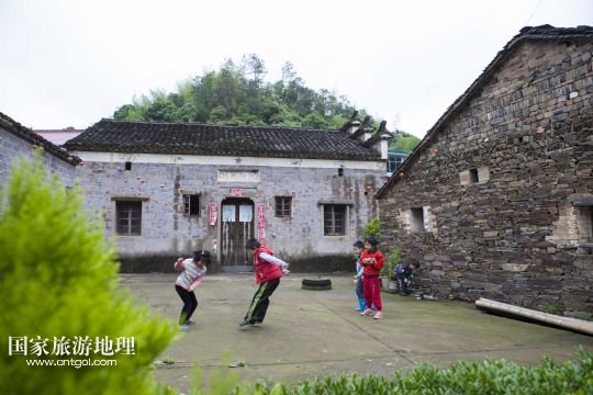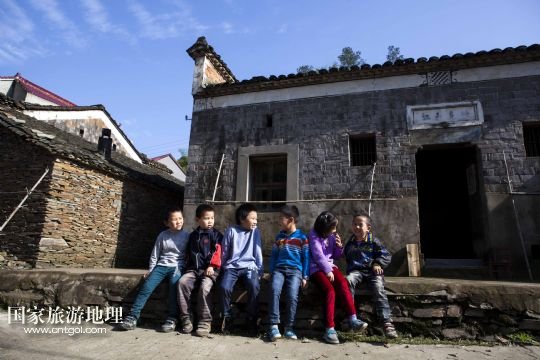 國家旅游地理 江西九江5月12日訊 5月12日,孩子們坐在土目源村的老房子前玩耍??沼牡纳焦龋幌⒌南?,斑駁的石墻,古樸的石屋。在江西省北部山區(qū),有一座石屋山居的古村落——都昌縣大港鎮(zhèn)土目源村。